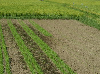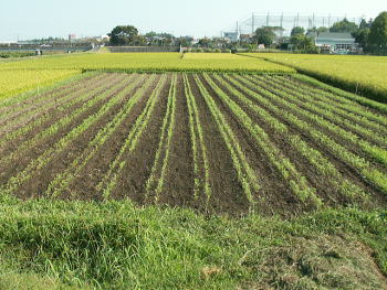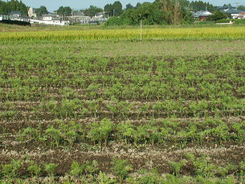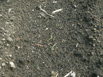 この畑は元々田圃だったところを客土して畑にしたそうで、畑にしてからすでに10年以上、遊休農地となっていたいました。 元々田圃であった為か、水分は多く発芽はすこぶる順調です。雑草の種も沢山落ちているのでしょう、雑草の発芽も旺盛です。