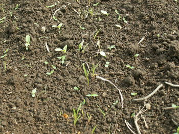 この畑は何度も種まきしましたが、雨が降らなくて発芽不良となったりで3回の種まきとなりました。 最後の種まきは、駄目元で9月末に行いました。ほとんど諦めてページにも載せてなかった人参が 春の訪れに目覚めたように、若葉を展開しています。