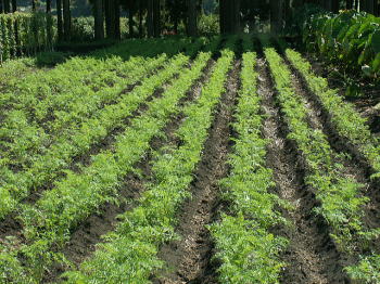 この度は4ヵ所の畑に早いところで8月2日播き、遅いところで9月1日と4回に分けて播種しました。 二条播きで畝幅は80cm、80cmにしたのは土寄せ後に畝間に1輪車で雑草堆肥、籾殻、米糠などの有機物を落として行く為です。 落とした有機物は人参の葉で覆われ直射日光をさえぎられた環境で小動物や微生物を養いながら、収穫が終わる頃には相当に腐熟が進んでいると想定しています。、 栽培しながら次作の準備、切れ目のない循環。自然の山野はそうなっていると思えます。