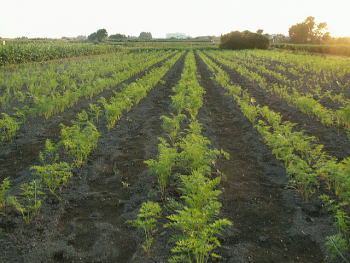緑色に見える所に雑草と人参が入り乱れて生えています。一本一本草を抜いて右の画像の様に人参だけを残して行きます。草の生えてない畝間はカカジリによる除草を数日前にやってます。ここまでに約28時間除草に要しました。草取りが終わったところは遠目には何も生えていないように見えます。 緑に見えたのはほとんど雑草だったということになります。